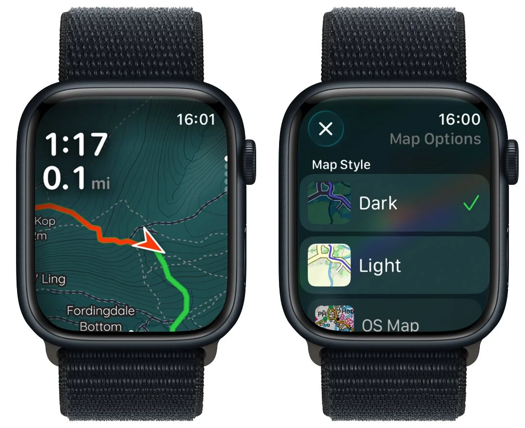 During a workout, Pedometer++ on the Apple Watch displays a custom map with workout metrics, including heart rate and HR zones, speed, and elevation changes.